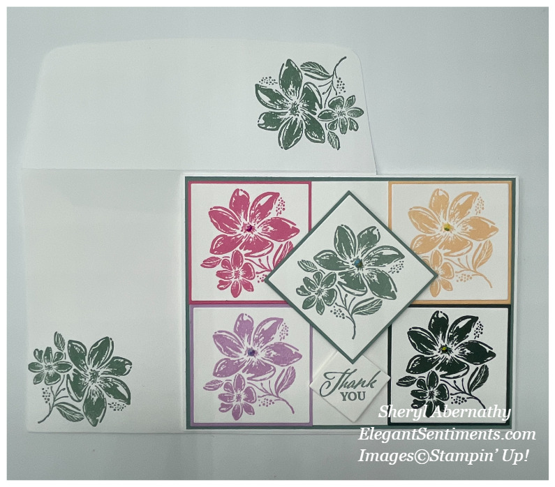 With this card, you are getting a SNEAK PEAK at the new IN COLORS, but also of a stamp and sentiment from the NEW Elegantly Said stamp set and the 2021-2023 In Color Jewels, all of which will be available when the new catalog is released on May 4th.