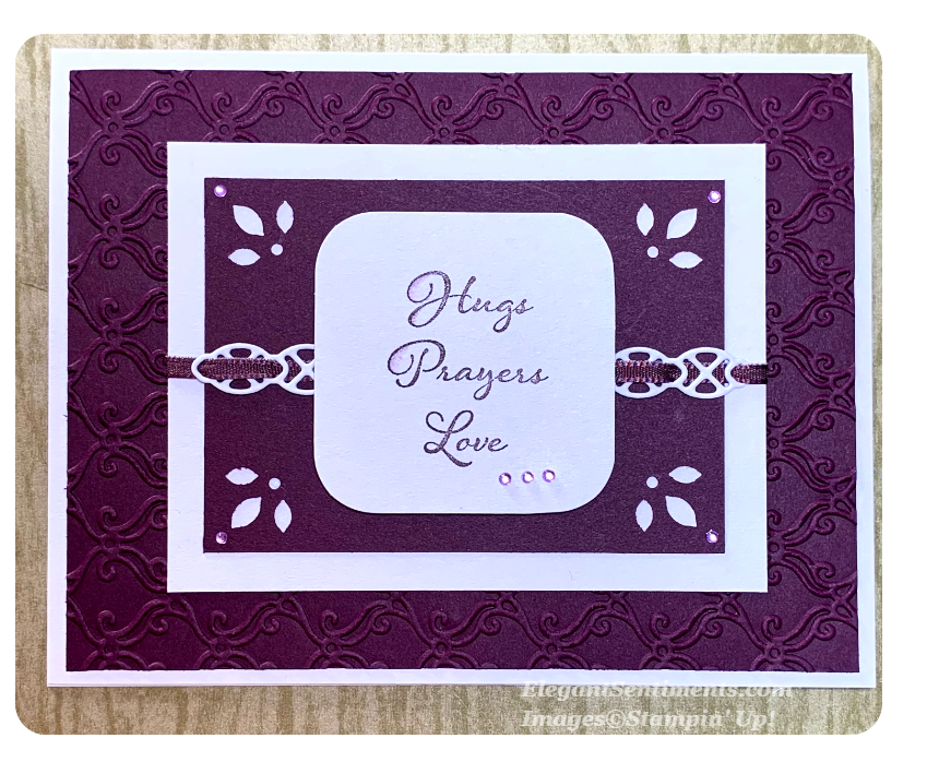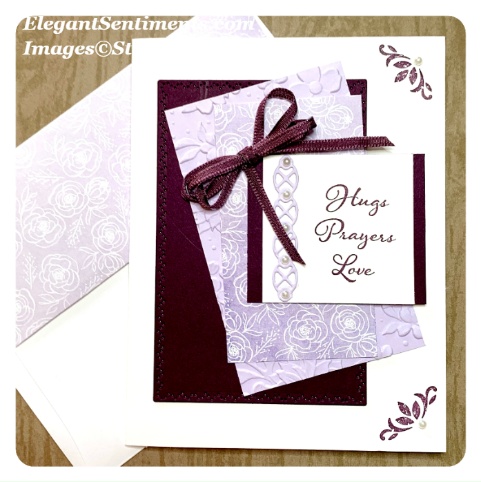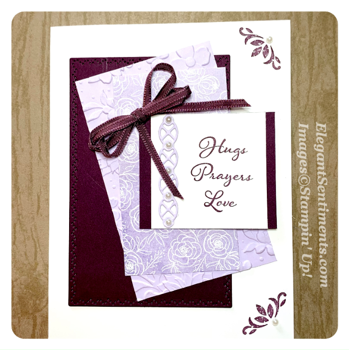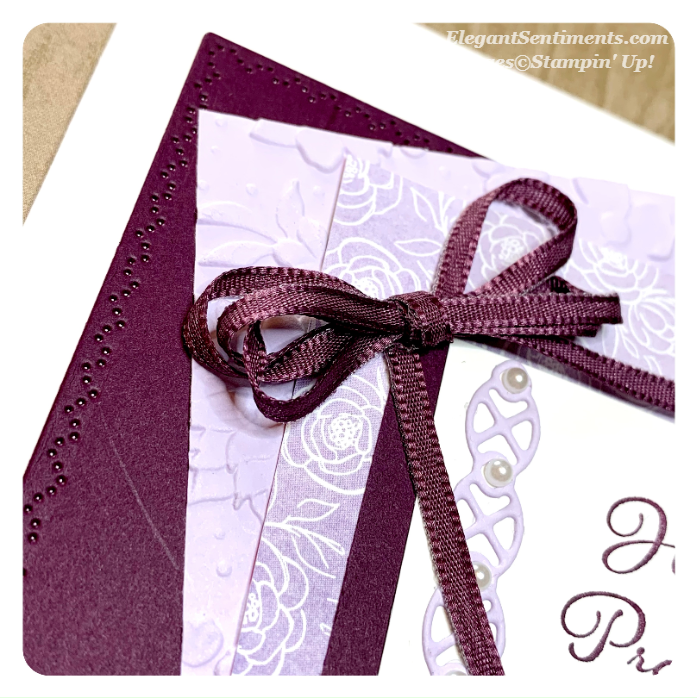 The card base is Blackberry Bliss and the embossed panel is Stylish Scroll (retired.) I like to use retired products in my posts on occasion to remind you that our products can continue to be used for years after they are no longer available for purchase. The floral strip of DSP is from our new Best Dressed set of papers. All the elements are die cuts from the Nature’s Thoughts die set.