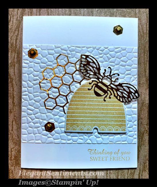 The Hammered Metal embossing folder created beautiful texture and backdrop for the die cuts on this card. The bee hive and sentiment were stamped with Golden Glitz Delicata ink. The bee, honeycomb and accents are all Gold foil.