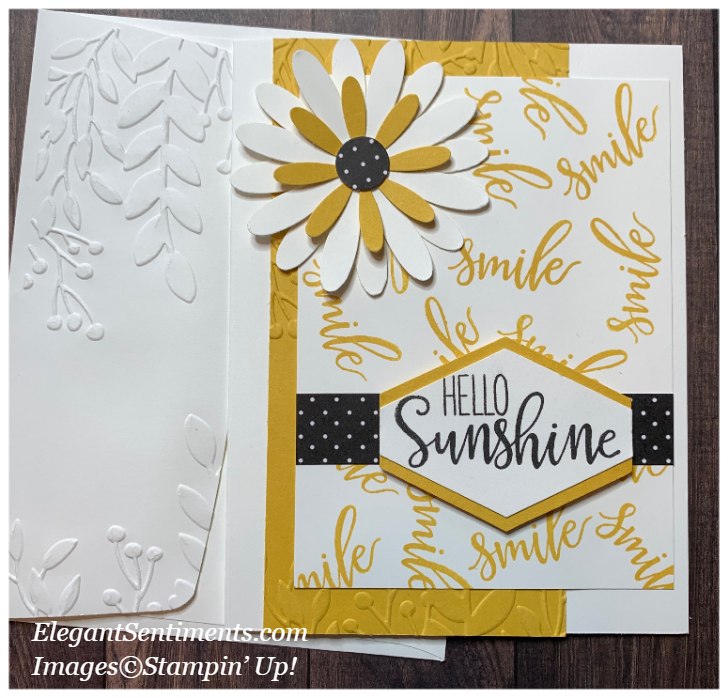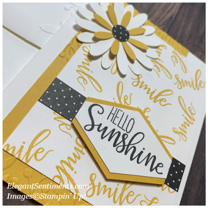 A Daisy always reminds me of sunshine so it was perfect to use for this card. I started with the new Greenery Embossing folder and used it to emboss a 2 3/4 x 5 1/2 panel of Bumblebee card stock. I stamped a 3 1/2 x 4 3/4 panel of Whisper White card stock with the smile stamp from the kit in Bumblebee ink. The polka dot strip from the kit served as the perfect backdrop for the sentiment panel which I created using the Tailored Tag punch. The sentiment panel is adhered to the card using extra Stampin DImensionals from the kit. The sentiment itself is stamped using stamps and Basic Black ink included in the kit. To create the daisy I used the Daisy and Medium Daisy punches. I punched a circle from kit remnants to create the daisy center.