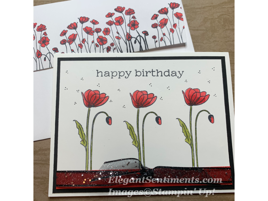 To create this card, I stamped the 3 poppies onto a 3 3/4 x 5 sheet of Whisper White card stock. I colored the flowers with Dark and Light Poppy Parade and Light Old Olive stamping blends, and used a Basic Black marker to make the accents around the flowers. Next, I stamped the happy birthday sentiment from the December 2019 Something for Everything Paper Pumpkin kit using Memento Black ink. Then, a 1 x 5 strip of Poppy Parade card stock was added to the base of the panel, and the strip was covered with Black Glittered Organdy ribbon. Finally, the panel was adhered to a 4 x 5 1/4 sheet of Basic Black card stock and added to a Thick Whisper White card stock base.