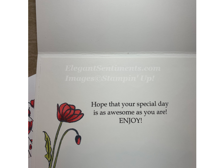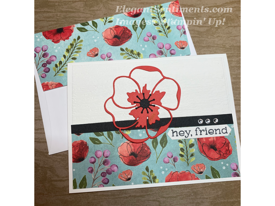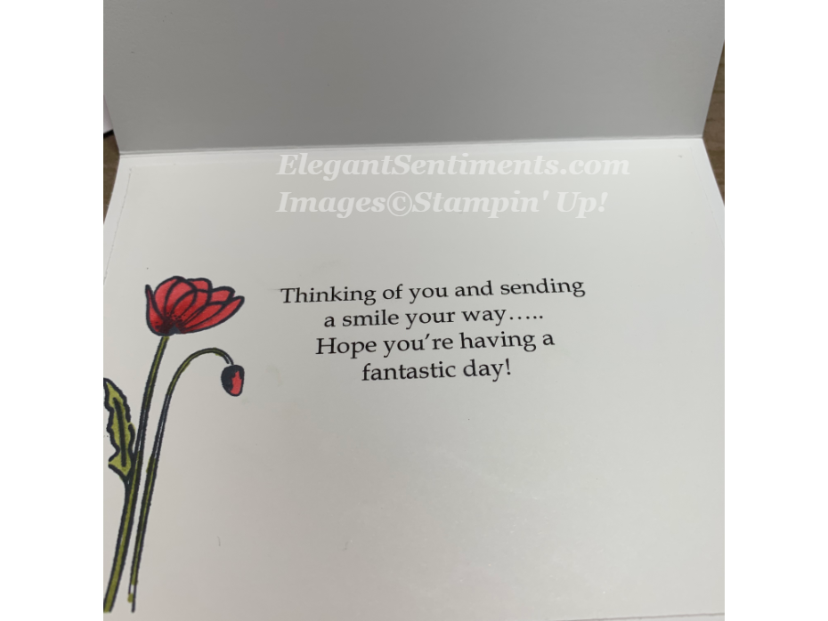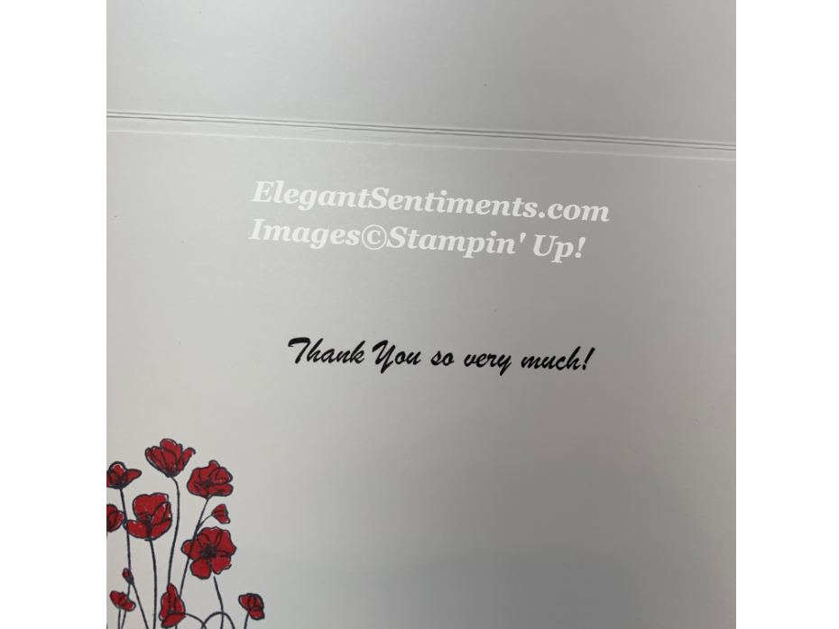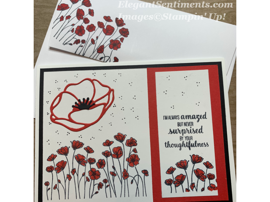 To create this card I started with the sentiment panel. I stamped poppies from the Painted Poppies stamp set onto a 1 1/2 x 3 1/2 piece of Whisper White card stock and colored them with Dark Poppy Parade Stampin’ Blends. Then, I stamped the sentiment from the Thoughtful Blooms (FREE) stamp set. Next, I adhered the sentiment panel to a 2 x 3 3/4 piece of Poppy Parade card stock. To complete the panel, I stamped poppies onto a 3 3/4 x 5 sheet of Whisper White card stock and colored them with Dark Poppy Parade Stampin’ Blends. Then, I die cut a Poppy and flower center using the Poppy Moments die set and adhered it to the panel. I used a Basic Black marker to create the accents. Finally, I adhered both panels together onto a Thick Whisper White card stock base.