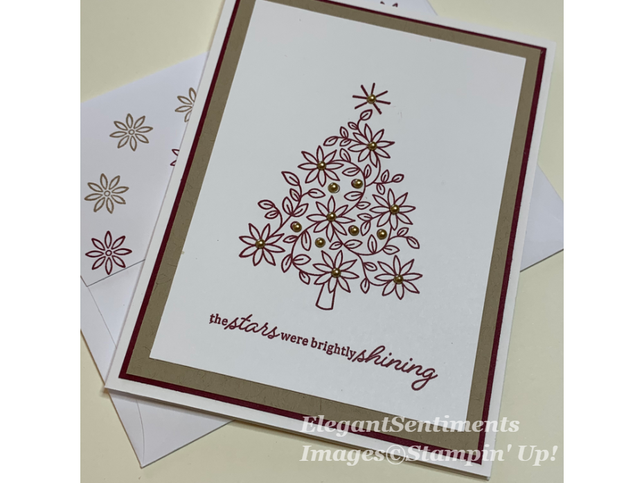 To create the first card, I layered panels of Merry Merlot, Crumb Cake and Whisper White card stock. On the white panel I stamped the tree and the sentiment with Merry Merlot ink and added Gold Metallic Pearls to embellish the tree.