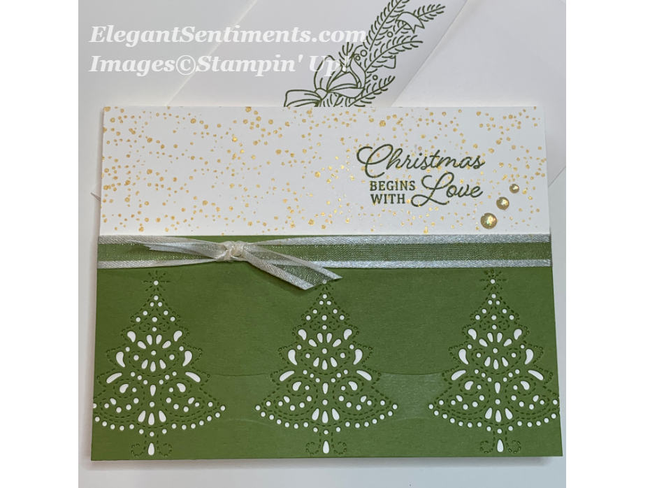 For the second card, I die-cut a trio of trees onto a panel of Old Olive card stock and adhered it to a card base made with Very Vanilla card stock. I created the background for the top of the card by using the spatter stamp from the Christmas Gleaming stamp set in Golden Glitz Delicata ink. The sentiment was stamped in Old Olive ink. Ribbon and Gold Glitter Enamel Dots add a finishing touch.