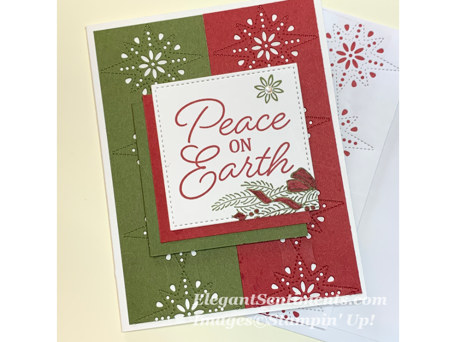 Finally, I married snowflake die cut panels in Mossy Meadow and Cherry Cobbler card stock on a Whisper White card base to create the last card. The sentiment panel is a layer of offset squares cut from the Stitched Squares dies set and the new Stampin’ Up! Paper Trimmer. The sentiment is stamped in coordinating Cherry Cobbler and Mossy Meadow inks.